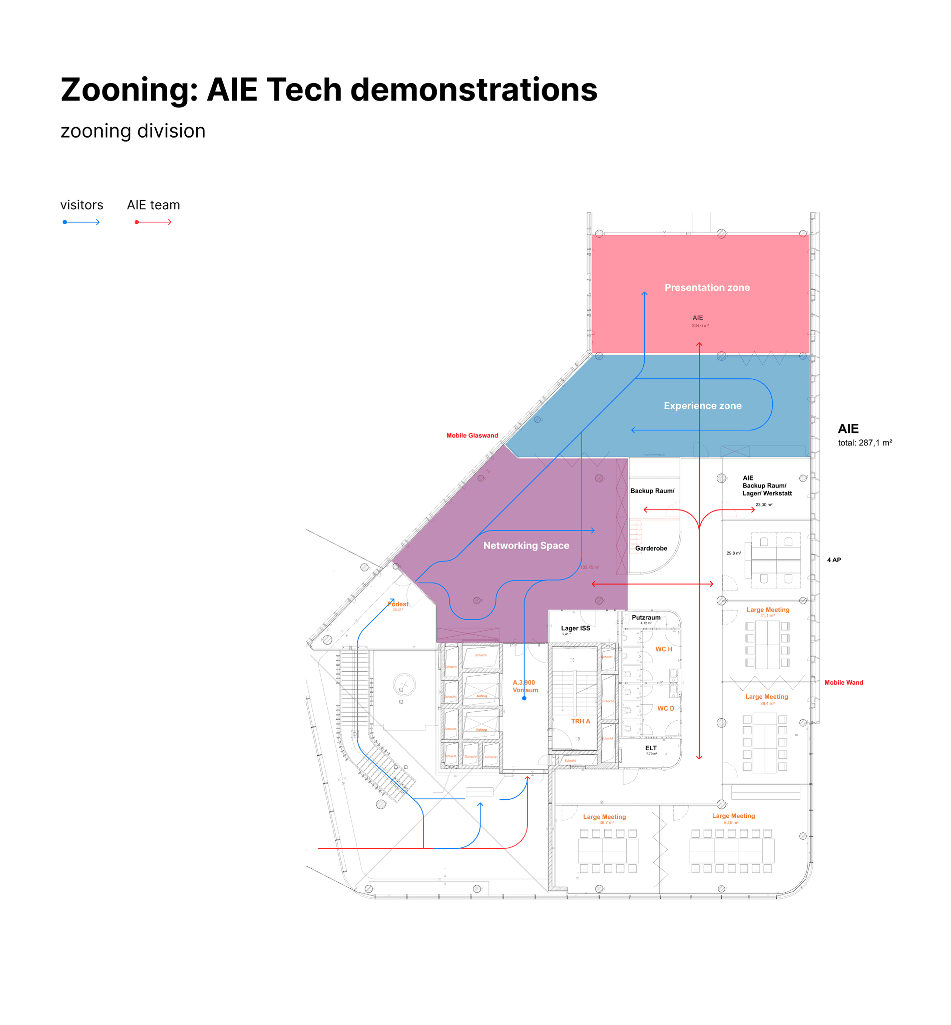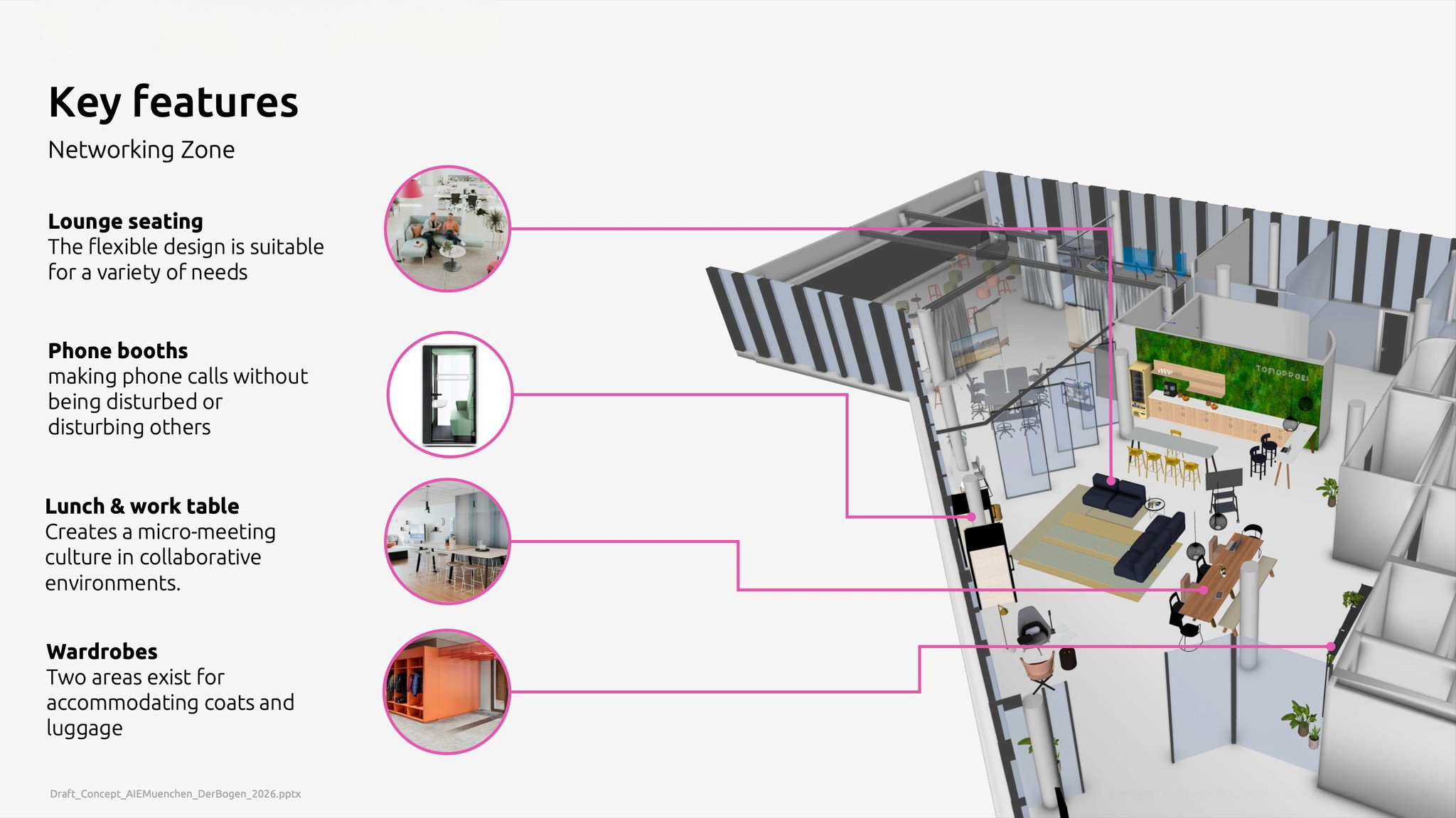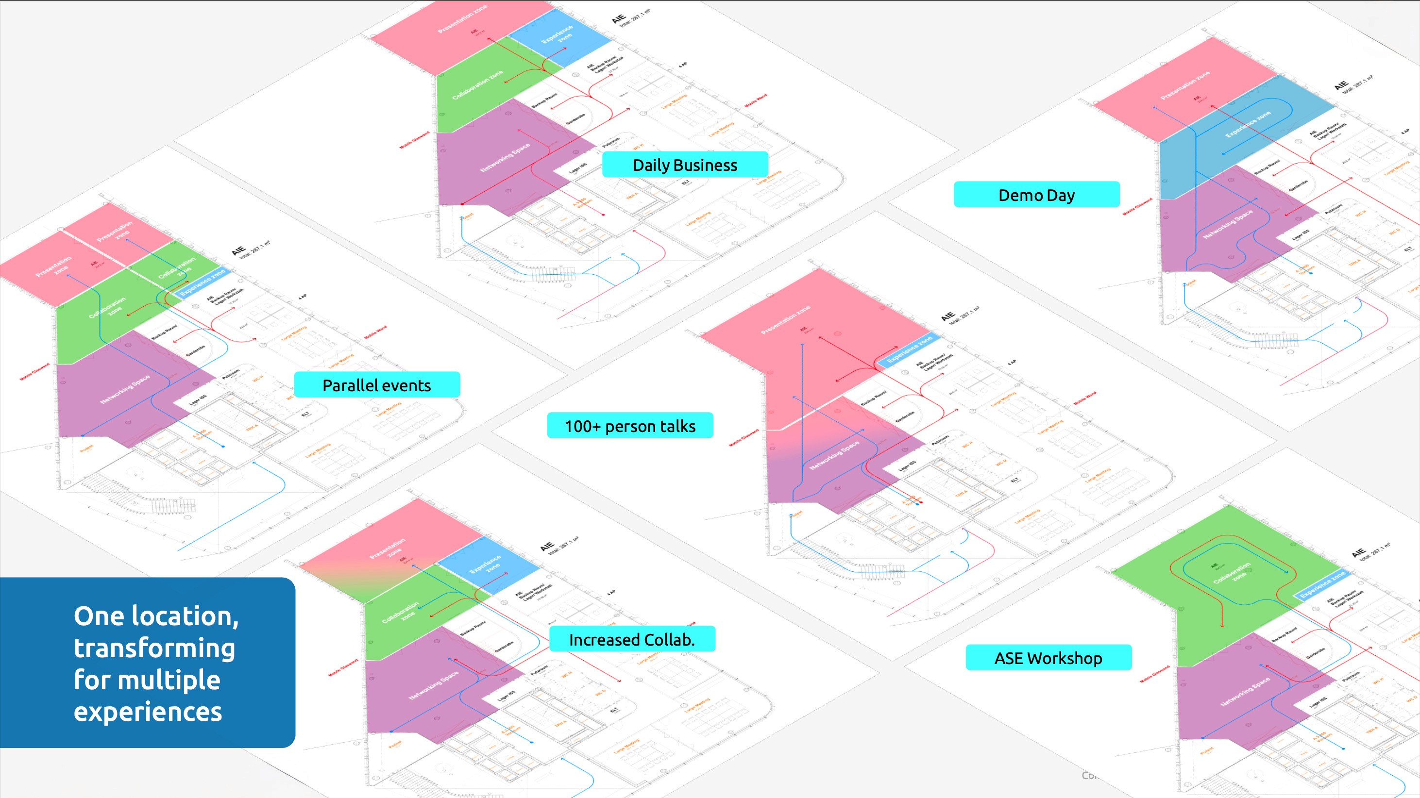 The design divides the space into distinct but connected zones: Entry, Networking, Experience, Collaboration, and Presentation. Each area responds to specific moments—informal chats, hands-on demos, large-scale presentations—using movable walls, adaptable furniture, and scalable tech setups for optimal modularity.