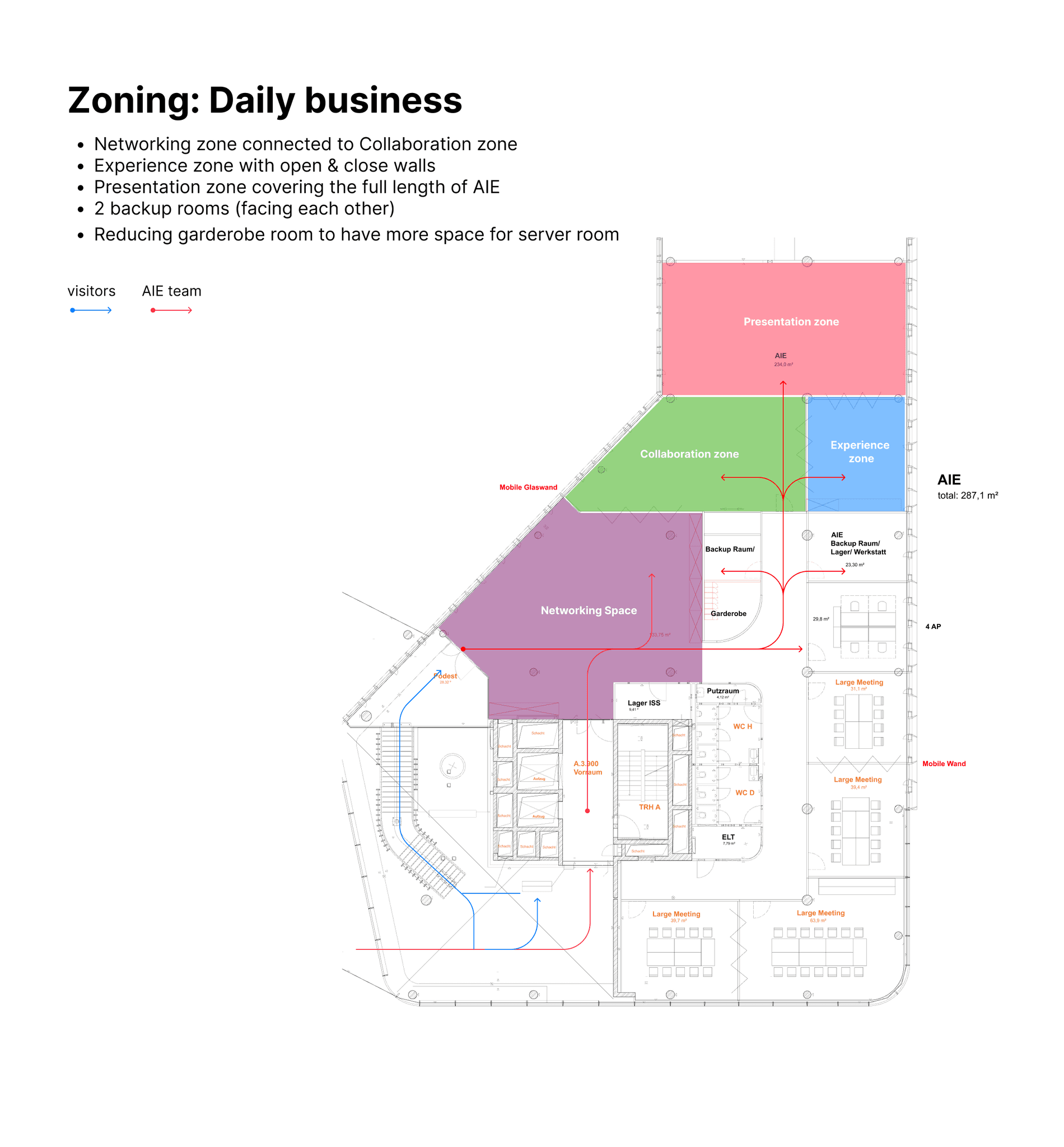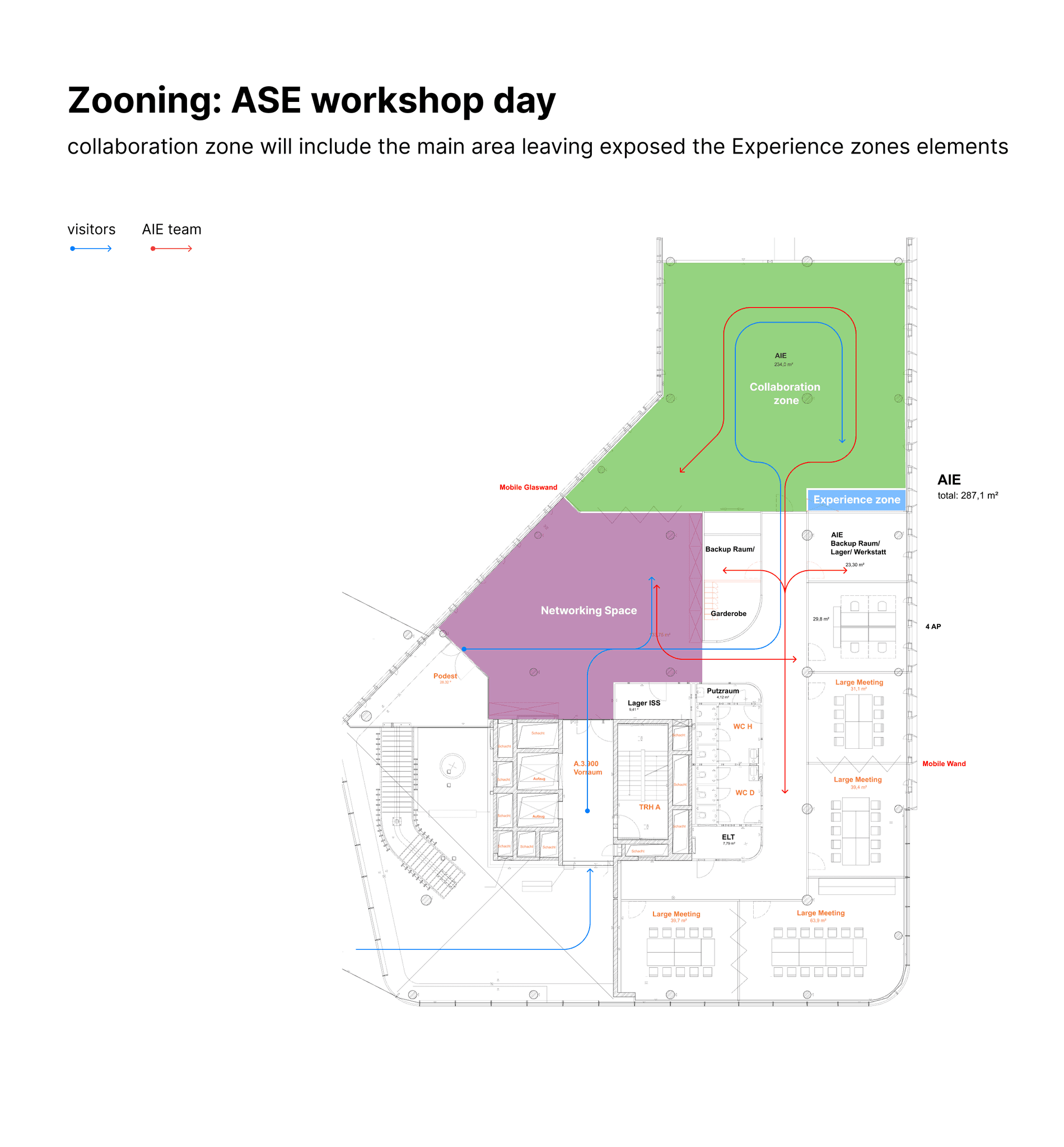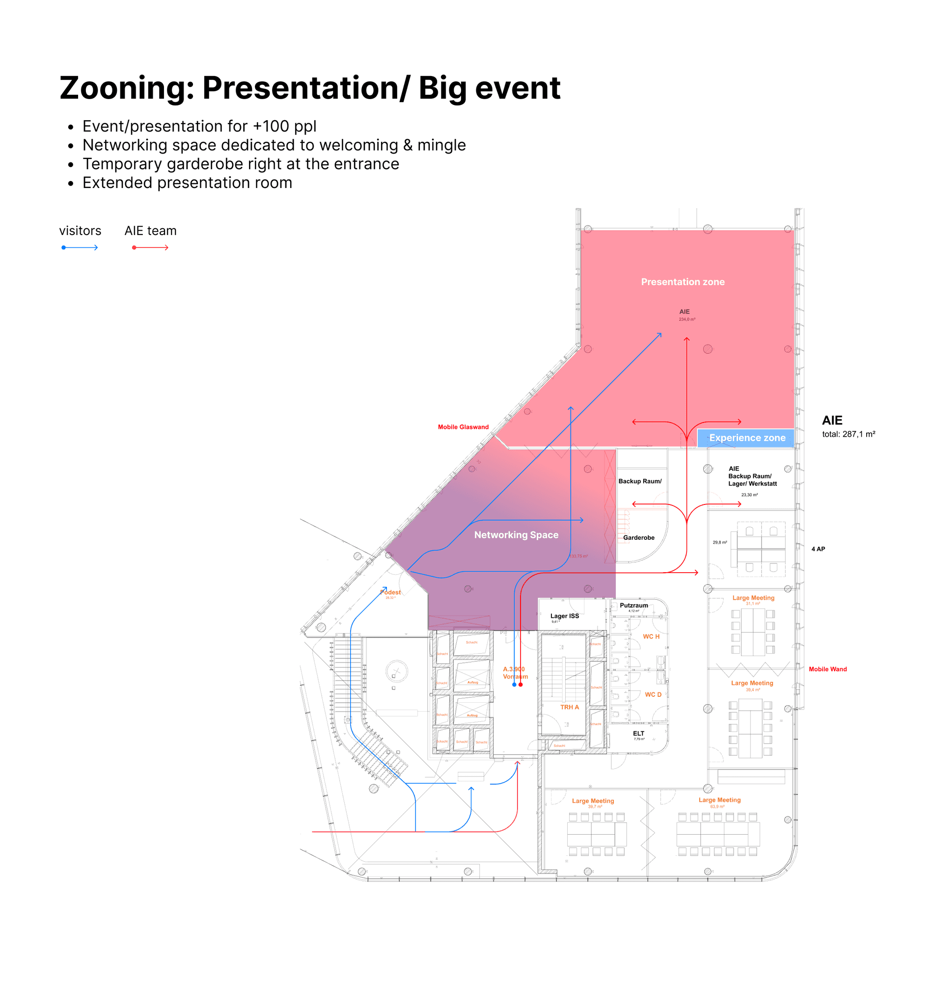 The design divides the space into distinct but connected zones: Entry, Networking, Experience, Collaboration, and Presentation. Each area responds to specific moments—informal chats, hands-on demos, large-scale presentations—using movable walls, adaptable furniture, and scalable tech setups for optimal modularity.
