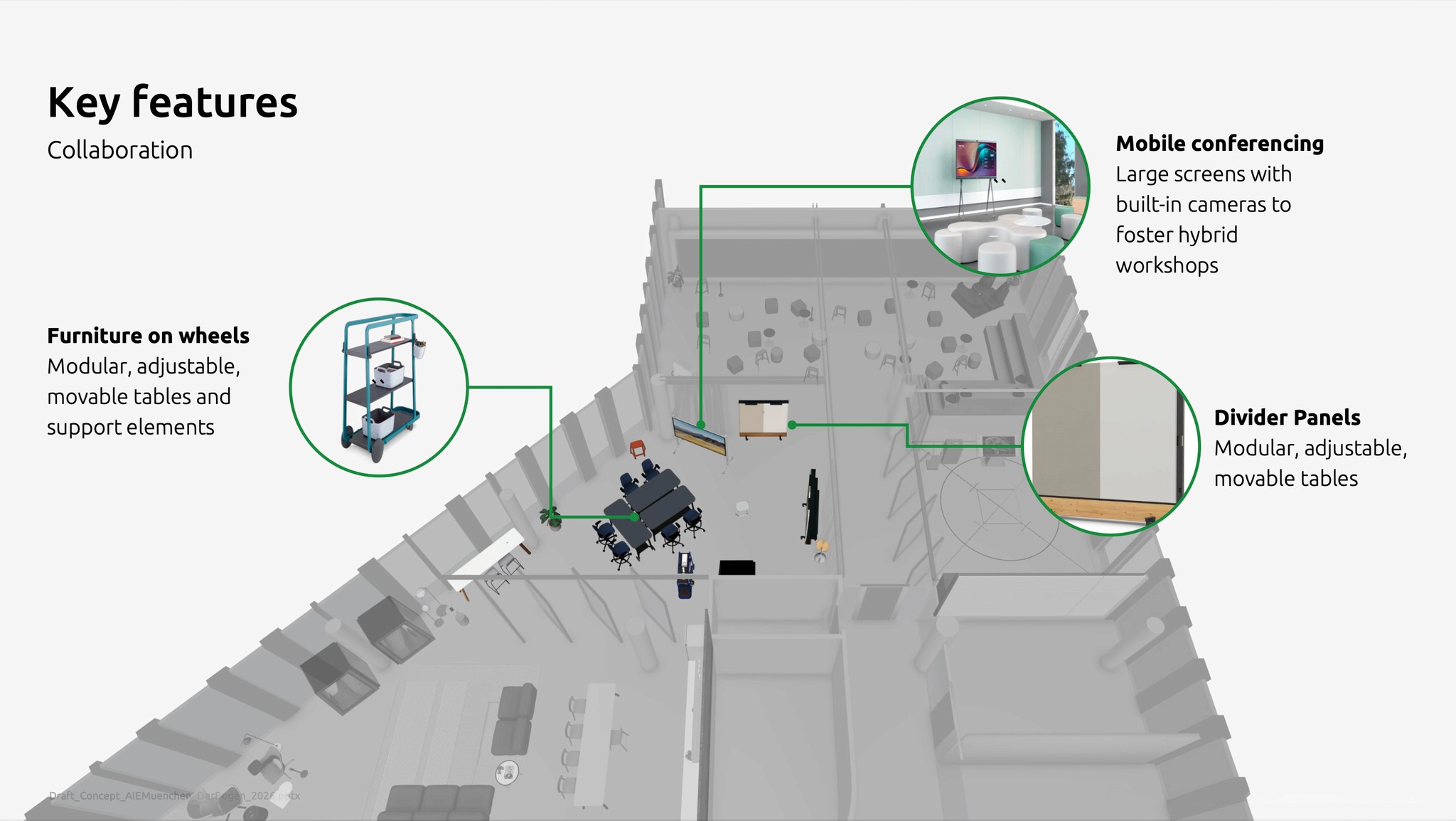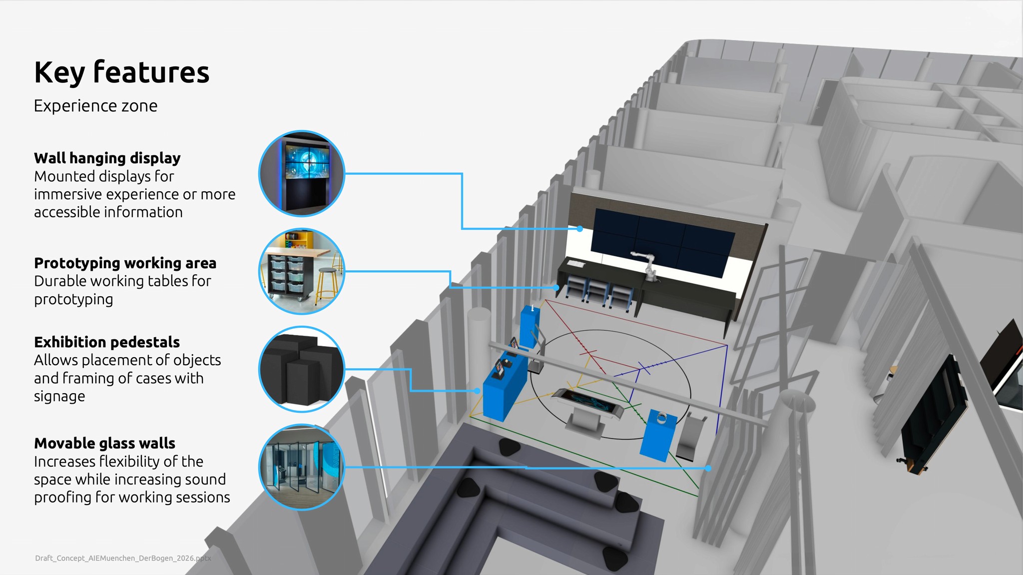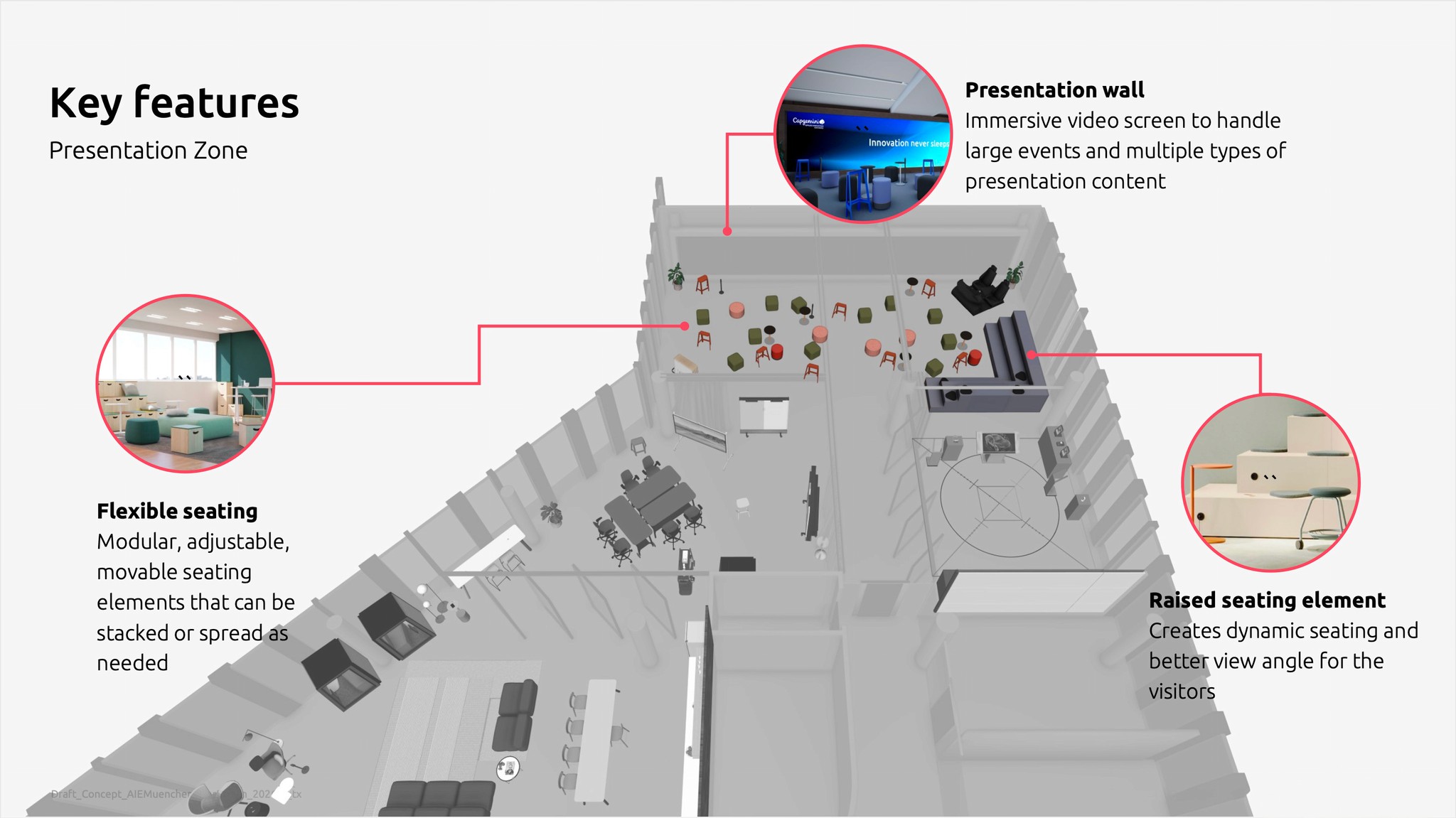 The final concept delivers a modular and future-ready environment that supports collaboration, showcases innovation, and reflects a forward-thinking identity. Designed with stakeholder input, it adapts seamlessly to diverse use cases while enhancing engagement and flow.